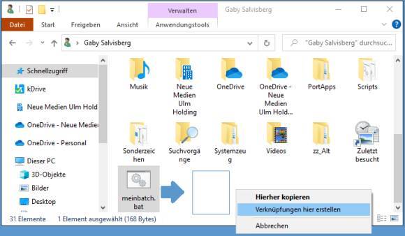 Nadal możesz to zrobić za pomocą skrótu. Załóżmy, że plik wsadowy nazywa się meinbatch.bat i znajduje się w C: \ Users \ Your Name \. Przeciągnij łącze z pliku wsadowego w dowolne miejsce, klikając plik prawym przyciskiem myszy i wybierając Utwórz łącze tutaj, gdy go zwolnisz; Możesz również utworzyć link tuż obok meinbatch.bat.